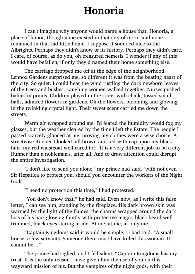 It's an ordinary little house, this Honoria. Owen does not trust it, or the ones who live inside. The lady of the house is dead. Her husband is far more eager to move on than he should be, and far too close to so-called "family friend" Miss Wellstone. Was Mrs. Albright's death a suicide, fueled by heartbreak? Or is this exactly what it seems to be?